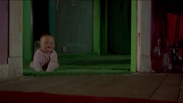 Trainspotting's cinematography employs a wide range of techniques involving the movement and position of the camera and, in a particularly striking way, the use of different lenses to stretch or reduce space. A short-focal length lens (a lens that distorts the shape and exaggerates the depth of what is in the frame) produces a tunnel effect, lengthening and narrowing Renton's bedroom when his parents lock him in to help him come off heroin and he begins to hallucinate (it is also used during Spud's interview to reflect the effects of the speed he has taken). To reflect his fragile mental state, tracking movements make the bed and room appear to slide around and extreme camera angles (of the baby as it falls and Renton's screaming response) are employed to help the audience feel the discomfort Renton feels.